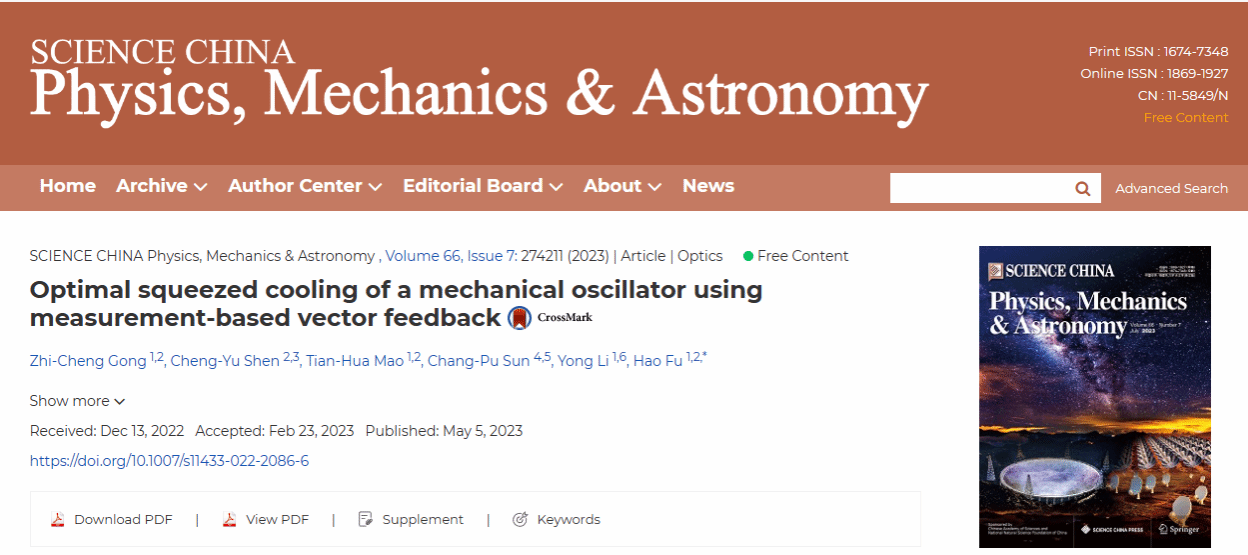 近日,公司伟德bv1946官网付号研究员与李勇教授团队在国际期刊《SCIENCE CHINA Physics, Mechanics & Astronomy》(JCR Q1,中科院1区Top期刊)发表了题为“Optimal squeezed cooling of a mechanical oscillator using measurement-based vector feedback”的研究论文。
