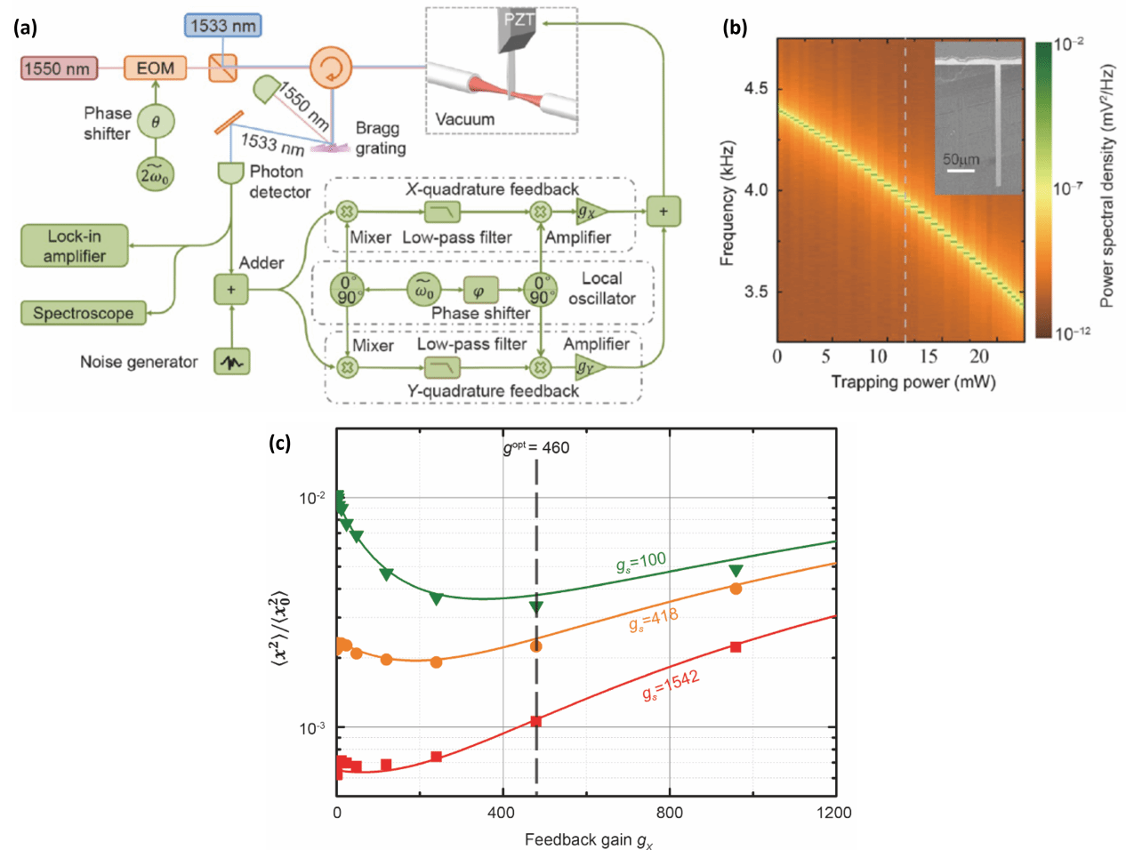 图1. (a)矢量反馈系统示意图;(b)光囚禁下的机械振子热振动谱; (c)最佳压缩冷却的实现。