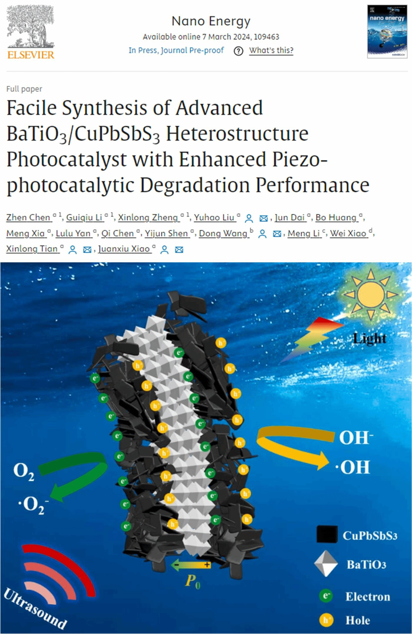 近期,伟德bv1946官网刘雨昊副教授在压电光催化研究领域取得进展,相关研究成果以题为《Facile Synthesis of Advanced BaTiO3/CuPbSbS3 Heterostructure Photocatalyst with Enhanced Piezo-photocatalytic Degradation Performance》发表于能源领域TOP期刊《Nano Energy》。2022级材料与化工专业硕士研究生陈真、2021级材料与化工专业硕士研究生李桂秋、2022级化学工程与技术专业博士研究生郑馨龙为论文共同第一作者;伟德bv1946官网刘雨昊副教授、生物医学工程公司王东教授、海洋科学与工程公司田新龙教授、肖娟秀教授为论文共同通讯作者。