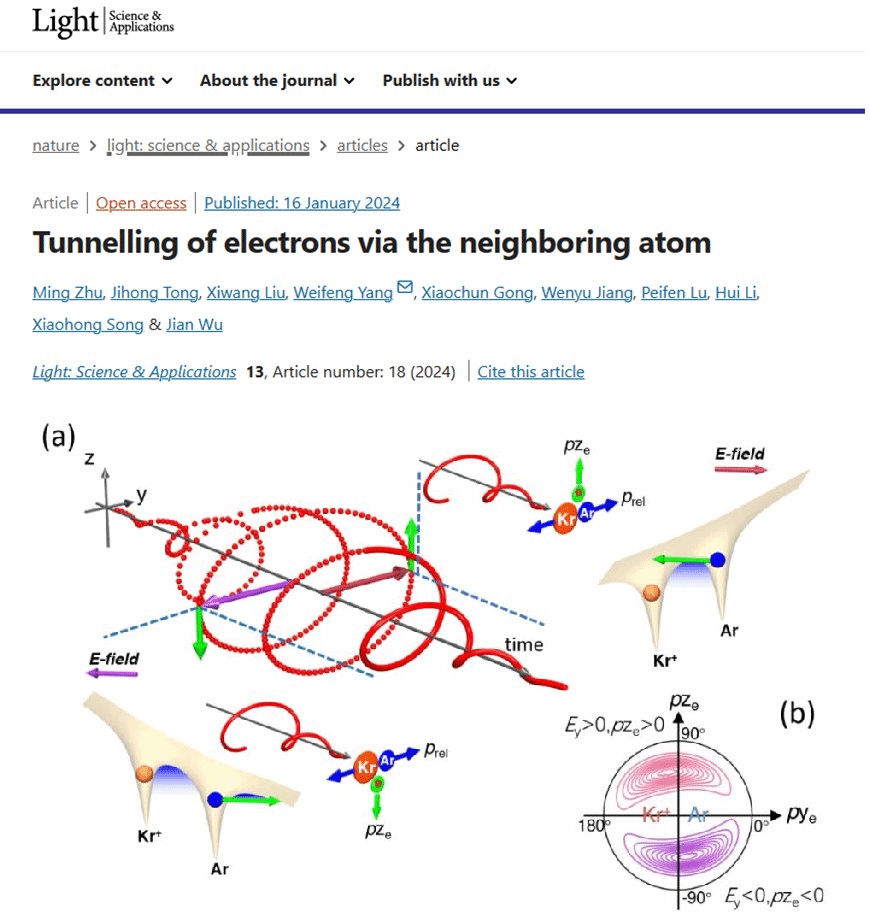 近日,伟德bv1946官网、理论物理研究中心杨玮枫教授所在团队在光学领域顶级期刊《Light: Science & Applications》发表题为《Tunnelling of electrons via the neighboring atom》的论文。该论文以伟德bv1946官网为第一完成单位,伟德bv1946官网博士研究生朱明和华东师范大学博士研究生童继红为论文的共同第一作者,伟德bv1946官网杨玮枫教授为论文的唯一通讯作者。