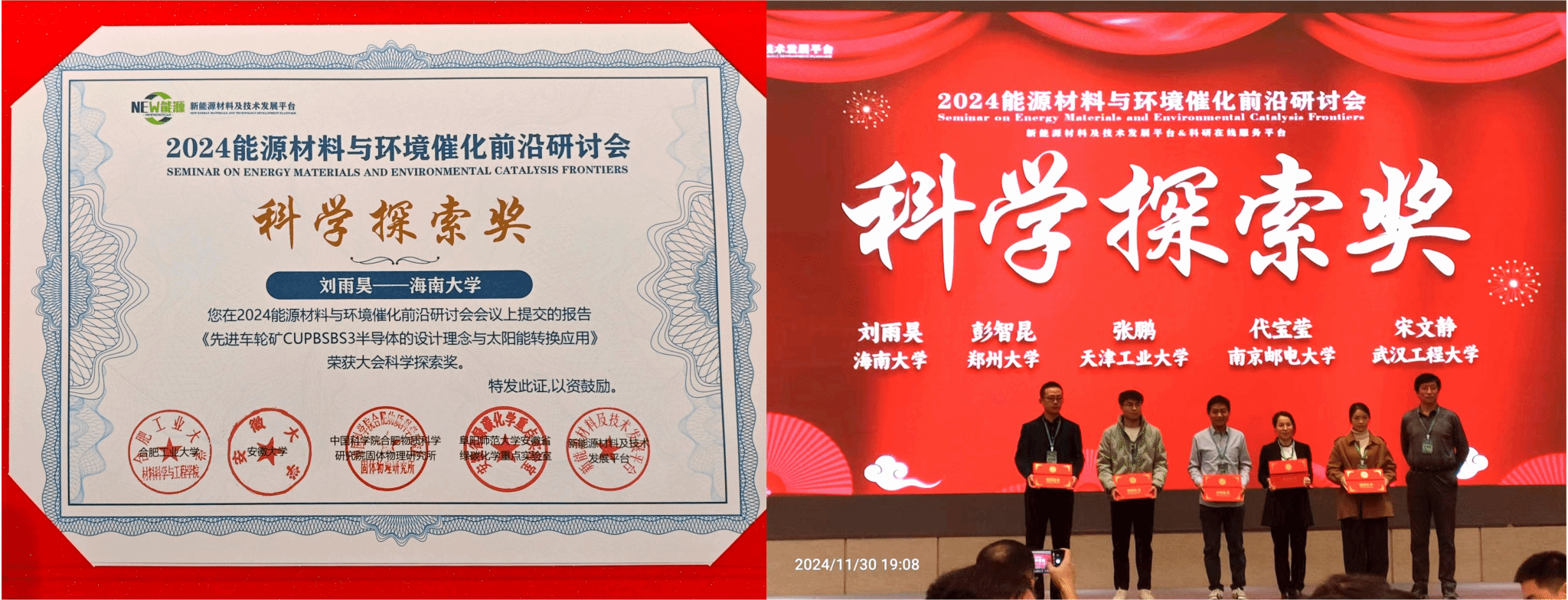 公司刘雨昊副教授在2024能源材料与环境催化前沿研讨会荣获科学探索奖