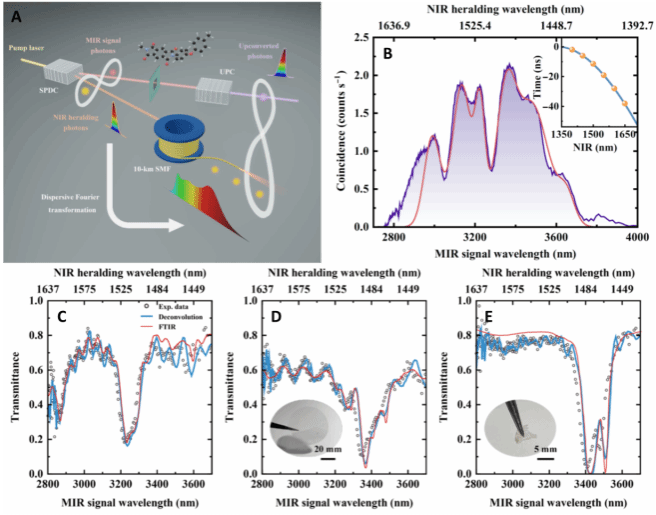 图1,上:( A )非局域波长-时间映射的中红外单光子上转换光谱示意图。利用SPDC过程获得关联光子对,其中红色球代表MIR信号光子,橙色球代表NIR预报光子。从样品中传输的MIR光子被上转换到NIR波段(紫球),以便使用成熟的硅基单光子探测器进行直接检测。此外,预报光子以较大的色散耦合到10-km的SMF中。利用色散傅里叶变换( DFT )技术将窄光脉冲(有色脉冲)的宽光谱映射为时间拉伸的时域波形。预报光子由超导纳米线单光子探测器( SNSPD )探测。( B ) 在1.18 μ m的宽光谱范围内,即使在0.21个/脉冲的低中红外光子通量下,也出现了高信噪比的符合光谱。红色曲线表示使用该模型对符合光谱的数值拟合。材料。小图为通过一系列带通滤波器得到的实验数据以及光纤色散的拟合情况。底部:MIR振动吸收光谱。聚酰亚胺( C )、聚碳酸酯( D )和聚乙烯( E )的透射光谱。实验观测到的透射率用黑色圆圈标出,而推导出的透射谱经过系统脉冲响应的反卷积后显示为蓝色线条。