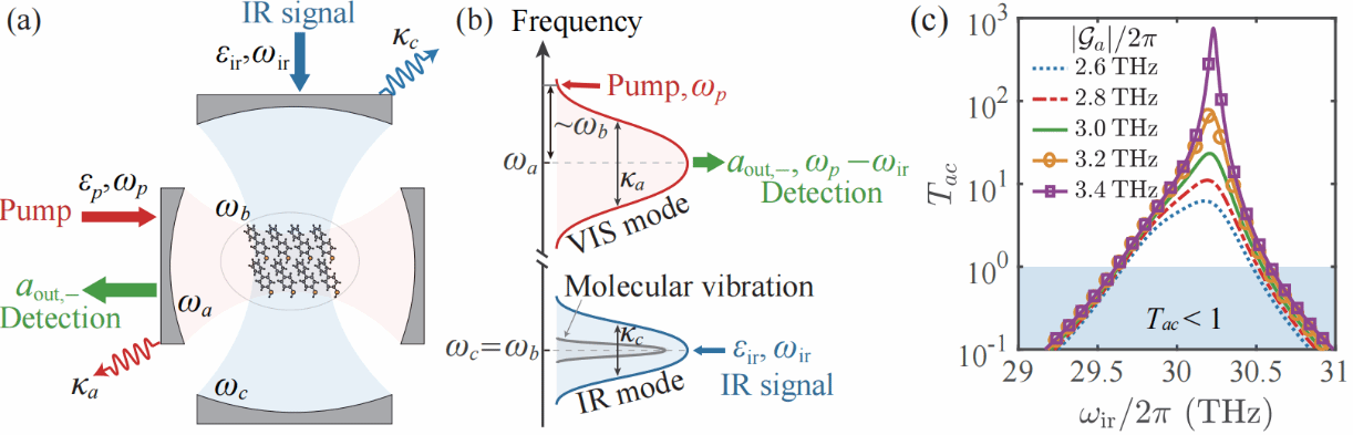 这种方案的实现基础是分子光力系统,该系统由大量分子和具有可见光和红外模式的等离基元纳米腔组成[图(a)]。在该方案中,被探测的红外信号与分子振动模式共振(或近共振),同时可见光模式被泵浦激光驱动,其中泵浦激光频率与可见光模式的第一斯托克斯边带近共振[图(b)]。通过调控纳米腔和分子参数,在可见光模式的第一斯托克斯边带处可实现1000倍或更高倍数的放大[图(c)]。当前的工作提出了一种新颖的红外信号检测方法,有望引起化学、生物和凝聚态物理学领域中理论和实验研究者的广泛关注。