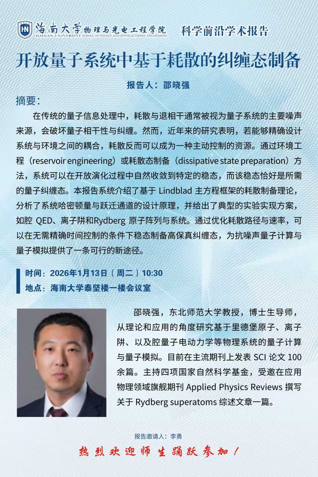 科学前沿学术报告(七十九):开放量子系统中基于耗散的纠缠态制备
